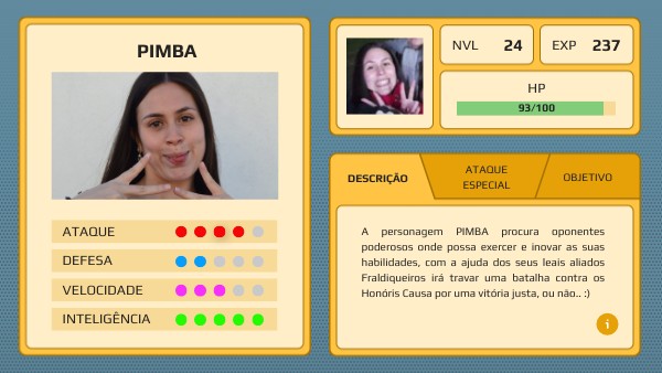 A personagem PIMBA procura oponentes poderosos onde possa exercer e inovar as suas habilidades, com a ajuda dos seus leais aliados Fraldiqueiros irá travar uma batalha contra os Honóris Causa por uma vitória justa, ou não.. :)