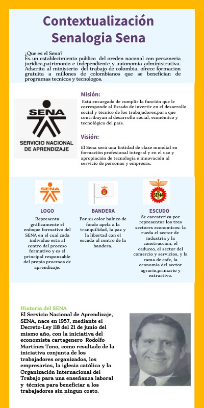 Historia del SENAEl Servicio Nacional de Aprendizaje, SENA, nace en 1957, mediante el Decreto-Ley 118 del 21 de junio del mismo año, con la iniciativa del economista cartagenero Rodolfo Martínez Tono, como resultado de la iniciativa conjunta de los trabajadores organizados, los empresarios, la iglesia católica y la Organización Internacional del Trabajo para una enseñanza laboral y técnica para beneficiar a los trabajadores sin ningun costo.