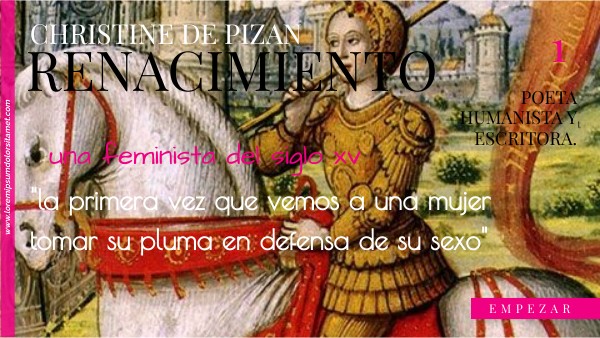 Christine la ponia en una situacion dificil su epoca y no por eso se rindio en lo que ella creia correcto y justo, tuvo que protestar de forma pacifica con sus obras, y luchar por no ser silenciada, es una feminista del renacimiento y no fue facil en esa epoca, por lo que para mi es de admiracion. Aunque haya disminuido el machismo y hayan dado derechos que merecen y que debieron tener desde un principio las mujeres aún así la sociedad sigue estando constituida por un patriarcado y siguen silenciando y haciendo menos por ser del sexo femenino, aunque como he dicho antes no se muestre tan abiertamente como en el pasado, sigue habiendo este problema. El feminismo no busca superar al hombre sino luchar por la equidad y pedir reconocimiento de derechos que han estado reservados para los hombres, supone la toma de conciencia de las mujeres como grupo o colectivo humano, de la opresión, dominación, y explotación, entre otras cosas con las que no se esta de acuerdo y daña la integridad de la mujer.