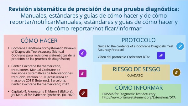 Revisión sistemática de precisión de una prueba diagnóstica: Manuales, estándares y guías de cómo hacer y de cómo reportar/notificarManuales, estándares y guías de cómo hacer y de cómo reportar/notificar/informar
