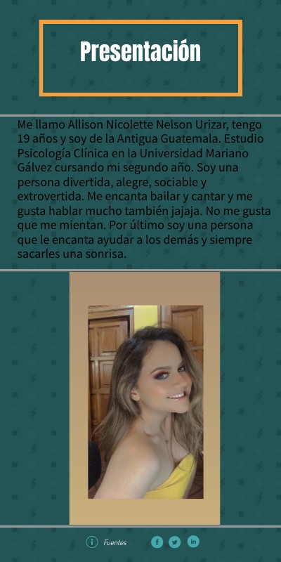 Me llamo Allison Nicolette Nelson Urizar, tengo 19 años y soy de la Antigua Guatemala. Estudio Psicología Clínica en la Universidad Mariano Gálvez cursando mi segundo año. Soy una persona divertida, alegre, sociable y extrovertida. Me encanta bailar y cantar y me gusta hablar mucho también jajaja. No me gusta que me mientan. Por último soy una persona que le encanta ayudar a los demás y siempre sacarles una sonrisa.