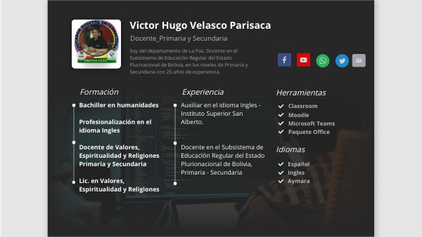 Soy del departamento de La Paz, Docente en el Subsistema de Educación Regular del Estado Plurinacional de Bolivia, en los niveles de Primaria y Secundaria con 25 años de experiencia.