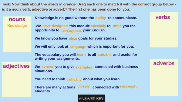 Task: Now think about the words in orange. Drag each one to match it with the correct group below - is it a noun, verb, adjective or adverb? The first one has been done for you: