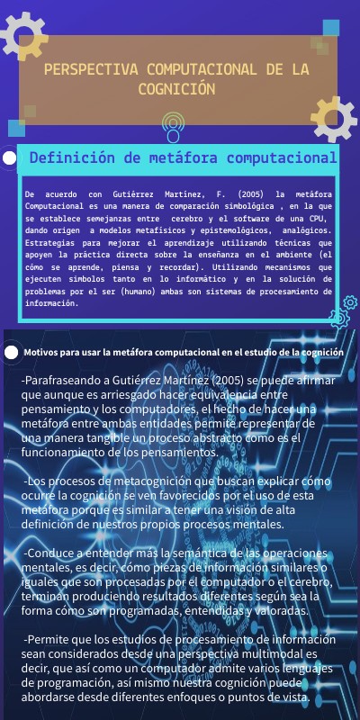 De acuerdo con Gutiérrez Martínez, F. (2005) la metáfora Computacional es una manera de comparación simbológica , en la que se establece semejanzas entre cerebro y el software de una CPU, dando origen a modelos metafísicos y epistemológicos, analógicos. Estrategias para mejorar el aprendizaje utilizando técnicas que apoyen la práctica directa sobre la enseñanza en el ambiente (el cómo se aprende, piensa y recordar). Utilizando mecanismos que ejecuten simbolos tanto en lo informático y en la solución de problemas por el ser (humano) ambas son sistemas de procesamiento de información.