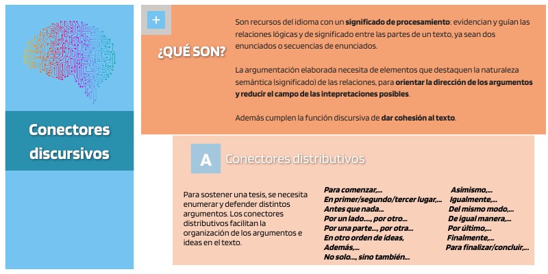 Para sostener una tesis, se necesita enumerar y defender distintos argumentos. Los conectores distributivos facilitan la organización de los argumentos e ideas en el texto.