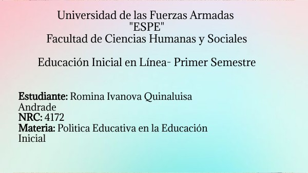 Estudiante: Romina Ivanova Quinaluisa AndradeNRC: 4172 Materia: Politica Educativa en la Educación Inicial