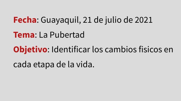 Fecha: Guayaquil, 21 de julio de 2021 Tema: La Pubertad Objetivo: Identificar los cambios fisicos en cada etapa de la vida.