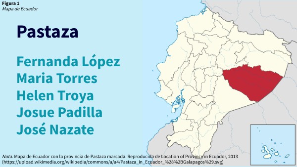 Comunicación Confeniae (2018, 27 de agosto). El 27 de agosto de 2018 Comunicación Confeniae anuncia al mundo la Lucha Histórica del pueblo Waorani de Pastaza [Publicación]. Facebook. https://www.facebook.com/comunicacionconfeniae.redacangau/posts/2260072500890826/CONAIE. (2014). Shuar. Confederación de Nacionalidades Indígenas del Ecuador. [Fotografía]. https://conaie.org/2014/07/19/shuar/Cueto, J. C. (2021, 2 marzo). La falta de control estatal durante la pandemia y el incremento de la demanda originó una fiebre de balsa a lo largo del río Pastaza en la Amazonía ecuatoriana. [Fotografía]. https://www.bbc.com/mundo/noticias-america-latina- 56073419D. (2011, 10 septiembre). División administrativa de la Provincia de Pastaza. [Ilustración]. https://es.wikipedia.org/wiki/Provincia_de_Pastaza#/media/Archivo:Cantones_de_Pastaza.pngEl Telégrafo. (2021, 25 julio). En Ecuador se liberan 29 especies en el Parque Nacional Yasuní [Fotografía]. https://www.eltelegrafo.com.ec/noticias/actualidad/44/ecuador-liberan-29-especies-parque-nacional-yasuni Eva S. (2016). Ayahuasca, usos en medicina. Webconsultas. https://www.webconsultas.com/curiosidades/ayahuasca-usos-en- medicina#:~:text=La%20ayahuasca%20es%20una%20bebida,un%20potente%20alucin%C3%B3geno%20denominado%20dimetiltriptamina%20Gastronomía de Ecuador. (2016, 9 diciembre). Chicha de yuca y chonta [Fotografía]. http://comidaecuatoriana2016.blogspot.com/2016/12/chicha-de-yuca-y-chonta.html
