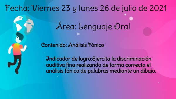 Indicador de logro:Ejercita la discriminación auditiva fina realizando de forma correcta el análisis fónico de palabras mediante un dibujo.