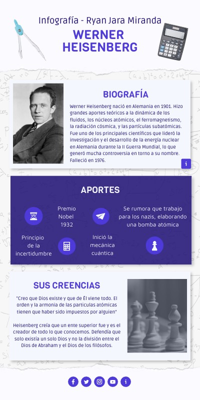 Werner Heisenberg nació en Alemania en 1901. Hizo grandes aportes teóricos a la dinámica de los fluidos, los núcleos atómicos, el ferromagnetismo, la radiación cósmica, y las partículas subatómicas. Fue uno de los principales científicos que lideró la investigación y el desarrollo de la energía nuclear en Alemania durante la II Guerra Mundial, lo que generó mucha controversia en torno a su nombre. Falleció en 1976.