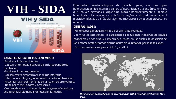 GENERALIDADES: -Pertenece al genero Lentivirus de la familia Retroviridae.L-os virus de este genero se caracterizan por fusionar y destruir las celulas hospederas y por producir infecciones lentas, en las cuales, la aparicion de los sintomas esta separada del momento de la infeccion por muchos años. -Se conocen dos serotipos: el VIH-1 y el VIH-2