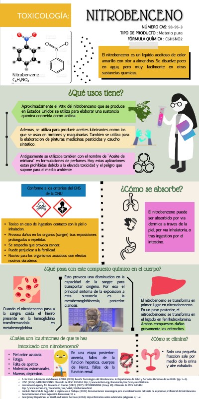 - Instituto Nacional de Seguridad e Higiene en el Trabajo. (2009). Documentación toxicológica para el establecimiento del límite de exposición profesional del nitrobenceno. Documentación Límites Exposición Profesional, 10, 4.