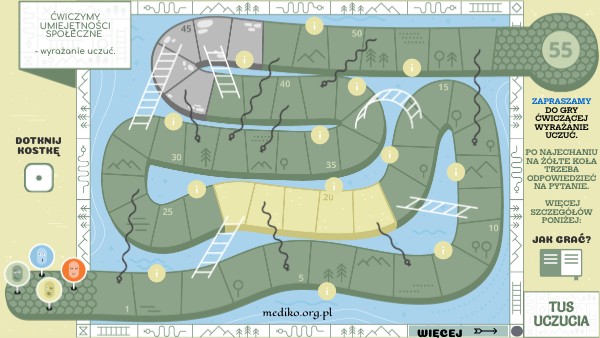 ZAPRASZAMY DO GRY ĆWICZĄCEJ WYRAŻANIE UCZUĆ. PO NAJECHANIU NA ŻÓŁTE KOŁA TRZEBA ODPOWIEDZIEĆ NA PYTANIE. WIĘCEJ SZCZEGÓŁÓW PONIŻEJ: