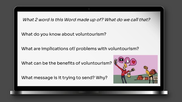 What 2 word is this Word made up of? What do we call that? What do you know about voluntourism? What are implications of/ problems with voluntourism? What can be the benefits of voluntourism? What message is it trying to send? Why?