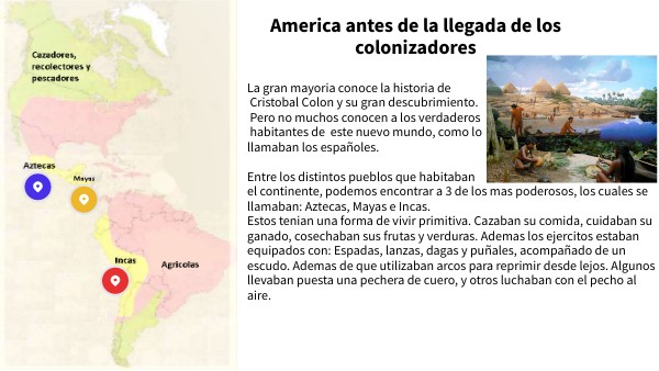La gran mayoria conoce la historia de Cristobal Colon y su gran descubrimiento. Pero no muchos conocen a los verdaderos habitantes de este nuevo mundo, como lo llamaban los españoles. Entre los distintos pueblos que habitaban el continente, podemos encontrar a 3 de los mas poderosos, los cuales se llamaban: Aztecas, Mayas e Incas. Estos tenian una forma de vivir primitiva. Cazaban su comida, cuidaban su ganado, cosechaban sus frutas y verduras. Ademas los ejercitos estaban equipados con: Espadas, lanzas, dagas y puñales, acompañado de un escudo. Ademas de que utilizaban arcos para reprimir desde lejos. Algunos llevaban puesta una pechera de cuero, y otros luchaban con el pecho al aire.