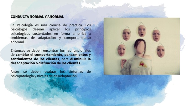 CONDUCTA NORMAL Y ANORMAL La Psicología es una ciencia de práctica. Los psicólogos desean aplicar los principios psicológicos sustentados en forma empírica a problemas de adaptación y comportamiento anormal. Entonces se deben encontrar formas funcionales de cambiar el comportamiento, pensamientos y sentimientos de los clientes, para disminuir la desadaptación o disfunción de los clientes. Antes se deben evaluar los síntomas de psicopatología y niveles de desadaptación.