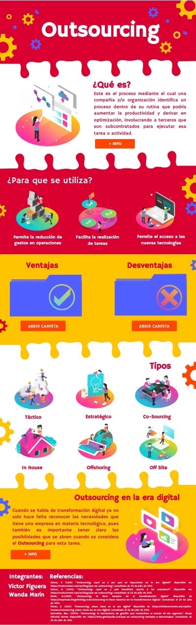 Lisboa, R (2019) “Outsourcing: ¿qué es y por qué es importante en la era digital?” disponible en: https://rockcontent.com/es/blog/que-es-outsourcing/ consultado el: 23 de julio de 2021Lisboa, R. (2019) “Outsourcing: ¿qué es y qué beneficios aporta a las empresas?” disponible en: https://rockcontent.com/es/blog/que-es-outsourcing/ consultado el 23 de julio de 2021 Rubio, D.(2019) “Outsourcing: la llave maestra de la transformación digital” disponible en https://empresas.blogthinkbig.com/outsourcing-la-llave-maestra-de-la-transformacion-digital/ consultado el 23 de julio de 2021. Flores, A. (2021) “Outsourcing, pieza clave en la era digital” disponible en https://mitsloanreview.mx/capital-humano/outsourcing-pieza-clave-en-la-era-digital/ consultado el 23 de julio de 2021. Schneider, Ben. (2004) "Outsourcing: la herramienta de gestión que revoluciona el mundo de los negocios". Grupo Editorial Norma disponible en: https://www.gestiopolis.com/que-es-outsourcing-ventajas-y-desventajas/ consultado el: 23 de julio de 2021