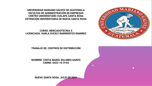 UNIVERSIDAD MARIANO GÁLVEZ DE GUATEMALA FACULTAD DE ADMINISTRACIÓN DE EMPRESAS CENTRO UNIVERSITARO CUILAPA SANTA ROSA EXTENCIÓN UNIVERSITARIA DE NUEVA SANTA ROSA CURSO: MERCADOTECNIA II LICENCIADA: KARLA SUCELY BARRIENTOS RAMIREZ TRABAJO DE: CENTROS DE DISTRIBUCIÓN NOMBRE: CINTIA MARÍA SOLARES GARZO CARNE: 6022-16-3165 NUEVA SANTA ROSA, JULIO DE 2021