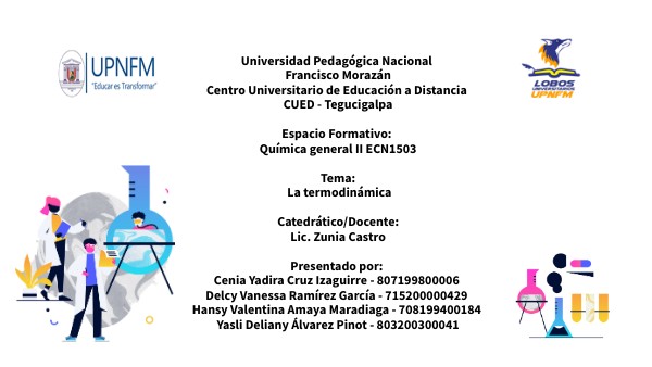 Universidad Pedagógica Nacional Francisco MorazánCentro Universitario de Educación a Distancia CUED - Tegucigalpa Espacio Formativo: Química general II ECN1503 Tema: La termodinámica Catedrático/Docente: Lic. Zunia Castro Presentado por: Cenia Yadira Cruz Izaguirre - 807199800006 Delcy Vanessa Ramírez García - 715200000429 Hansy Valentina Amaya Maradiaga - 708199400184 Yasli Deliany Álvarez Pinot - 803200300041