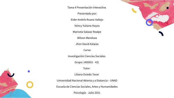 Tarea 4 Presentación interactiva Presentado por: Eider Andrés Ruano Vallejo Yeincy Yuliana Hoyos Maricela Salazar Realpe Wilson Mendoza Jhon David Astaiza Curso: Investigación Ciencias Sociales Grupo: (400001 - 43) Tutor: Liliana Oviedo Tovar Universidad Nacional Abierta y a Distancia – UNAD Escuela de Ciencias Sociales, Artes y Humanidades Psicología - Julio 2021