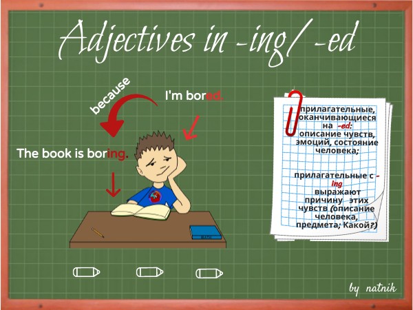 прилагательные, оканчивающиеся на -ed: описание чувств, эмоций, состояние человека; прилагательные с -ing выражают причину этих чувств (описание человека, предмета; Какой?)