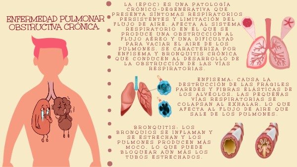 La (EPOC) es una patología crónico-degenerativa que presenta síntomas respiratorios persistentes y limitación del flujo de aire, afecta al sistema respiratorio en el que se produce una obstrucción al flujo aéreo y una dificultad para vaciar el aire de los pulmones. Se caracteriza por enfisema y bronquitis crónica que conducen al desarrollo de la obstrucción de las vías respiratorias.