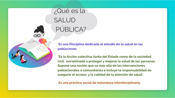 Es una Disciplina dedicada al estudio de la salud en las poblaciones. *Es la Acción colectiva, tanto del Estado como de la sociedad civil, encaminada a proteger y mejorar la salud de las personas. Supone una noción que va más allá de las intervenciones poblacionales o comunitarias e incluye la responsabilidad de asegurar el acceso y la calidad de la atención de salud. Es una práctica social de naturaleza interdisciplinaria.