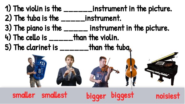 1) The violin is the ______instrument in the picture. 2) The tuba is the _____instrument. 3) The piano is the _____ instrument in the picture. 4) The cello is _____than the violin. 5) The clarinet is ______than the tuba.