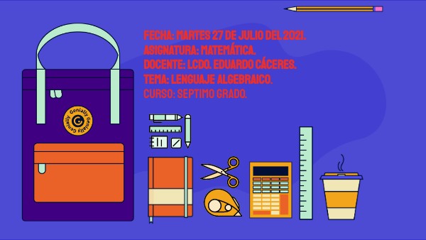 Fecha: martes 27 de julio del 2021. Asignatura: matemática. docente: lcdo. eduardo cáceres. tema: lenguaje algebraico. curso: septimo grado.