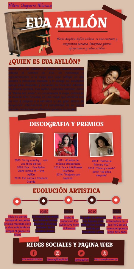 Nació un 7 de Febrero. Al iniciar su carrera artística adopta el nombre de EVA, en homenaje y agradecimiento a la mujer que supo reflejar en ella valores y principios morales, y le otorgó su constante apoyo para despertar y encauzar su vocación artística: su abuela querida. Eva Ayllón, conocida también como la “Reina del Landó”, es considerada la mejor cultora de la música Afro Peruana, es una mujer que encanta con su voz a propios y a extraños y una gran artista de proyección internacional. La versatilidad de su voz le permite incursionar en diversos géneros musicales