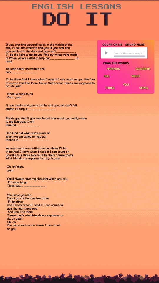 You know you can Count on me like one two three I'll be there And I know when I need it I can count on you like four three two And you'll be there 'Cause that's what friends are supposed to do, oh yeah Oh, oh You can count on me 'cause I can count on you