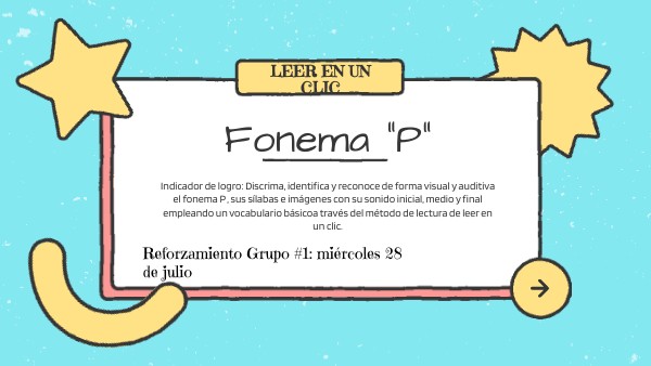 Indicador de logro: Discrima, identifica y reconoce de forma visual y auditiva el fonema P , sus sílabas e imágenes con su sonido inicial, medio y final empleando un vocabulario básicoa través del método de lectura de leer en un clic.