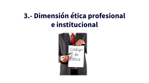 La ética profesional se entiende como un campo enfocado a los códigos y normas de conducta aplicable a todas las profesiones y ética institucional constituye un conjunto de aspiraciones morales, normas, costumbres, creencias y otros, que dan forma a una institución.