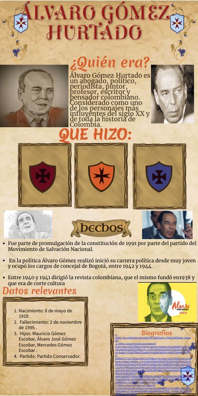1. https://es.wikipedia.org/wiki/%C3%81lvaro_G%C3%B3mez_Hurtado 2. https://www.google.com/search?q=en+que+a%C3%B1o+murio+alvaro+gomez+hurtado&hl=es&sxsrf=ALeKk021wFDlZpSft4wQa_or7llyjUkh1A%3A1627478331390&source=hp&ei=O1kBYfWaFZSIwbkPgYu82AQ&iflsig=AINFCbYAAAAAYQFnS-EkBkMIJ771XC783qmXtOrTuPFh&oq=en+que+a%C3%B1o+ancio+alvaro+gomez+hu&gs_lcp=Cgdnd3Mtd2l6EAEYADIGCAAQFhAeOgcIIxDqAhAnOgQIIxAnOgQILhBDOgoIABCxAxCDARBDOggIABCxAxCDAToLCC4QsQMQxwEQowI6AgguOgUIABCxAzoECAAQQzoHCAAQhwIQFDoICC4QsQMQgwE6CwguELEDEMcBEK8BOgIIADoECAAQDToGCAAQDRAeOgkIABANEEYQ-wE6CAghEBYQHRAeOgoIIRAWEAoQHRAeOgQIIRAKOgcIIRAKEKABUOwwWNl8YIeJAWgBcAB4AIABhwKIAcctkgEHMC4yMi4xMJgBAKABAaoBB2d3cy13aXqwAQo&sclient=gws-wiz 3. https://www.google.com/search?q=caricaturas+de+alvaro+gomez+hurtado&rlz=1C1CHBD_esCO903CO903&sxsrf=ALeKk03OINBpy68Al5bADszbTVQ2_UjnPw:1627595734188&source=lnms