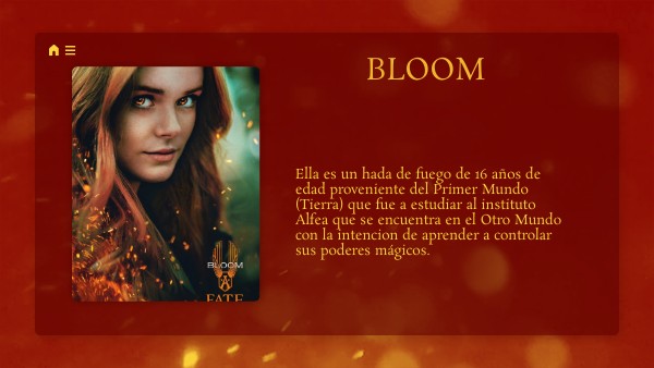 Ella es un hada de fuego de 16 años de edad proveniente del Primer Mundo (Tierra) que fue a estudiar al instituto Alfea que se encuentra en el Otro Mundo con la intencion de aprender a controlar sus poderes mágicos.Bloom llevaba una vida normal, hasta el momento en el que tuvo una discusión con su madre y no pudo dormir por lo furiosa que estaba, en medio de la noche la casa pronto se llenó de llamas y su madre quedó con quemaduras graves. Sintiéndose culpable y asustada por lo ocurrido se escondió en un depósito abandonado mientras intentaba descifrar que pasaba con ella y como evitar quemar todo a su alrededor. Dowling apareció ante ella y la invitó a la escuela Alfea para aprender a controlar sus poderes. Bloom por un momento tenía dudas y pensó en regresar a casa hasta que Dowling mencionó que sabía sobre el incendio, al igual del miedo que la joven tenía de que volviera lastimar a sus padres.