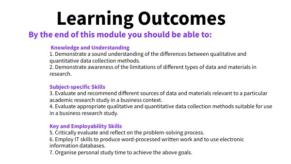 Knowledge and Understanding1. Demonstrate a sound understanding of the differences between qualitative and quantitative data collection methods. 2. Demonstrate awareness of the limitations of different types of data and materials in research. Subject-specific Skills 3. Evaluate and recommend different sources of data and materials relevant to a particular academic research study in a business context. 4. Evaluate appropriate qualitative and quantitative data collection methods suitable for use in a business research study. Key and Employability Skills 5. Critically evaluate and reflect on the problem-solving process. 6. Employ IT skills to produce word-processed written work and to use electronic information databases. 7. Organise personal study time to achieve the above goals.