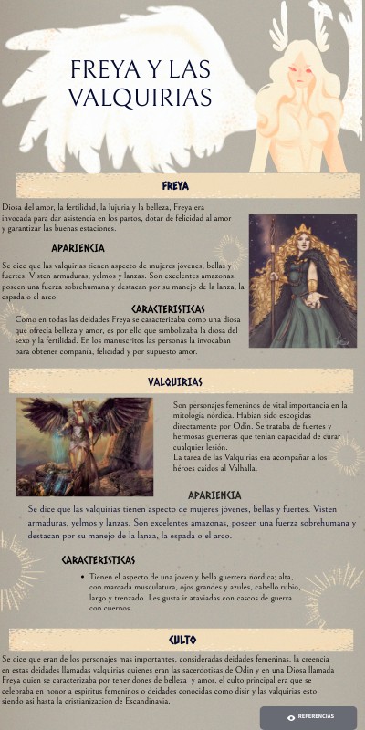Son personajes femeninos de vital importancia en la mitología nórdica. Habían sido escogidas directamente por Odín. Se trataba de fuertes y hermosas guerreras que tenían capacidad de curar cualquier lesión. La tarea de las Valquirias era acompañar a los héroes caídos al Valhalla.