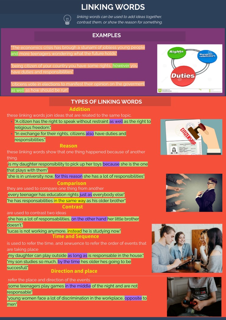 these linking words show that one thing happened because of another thing."is my daughter responsibility to pick up her toys because she is the one that plays with them""she is in university now, for this reason she has a lot of responsibilities" they are used to compare one thing from another "every teenager has education rights just as everybody else" "he has responsabilities in the same way as his older brother" are used to contrast two ideas "she has a lot of responsabilities, on the other hand her little brother doesn't." "lucas is not working anymore, instead he is studying now." is used to refer the time, and sewuence to refer the order of events that are taking place "my daughter can play outside as long as is responsable in the house." "my son studies so much, by the time hes older hes going to be succesfull" refer the place and direction of the events "some teenagers play games in the middle of the night and are not responsable" "young women face a lot of discrimination in the workplace, opposite to men"Título 2