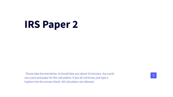 Please take the test below. It should take you about 10 minutes. You could use a pen and paper for the calculation. If you do not know, just type a hyphen into the answer blank. NO calculators are allowed.