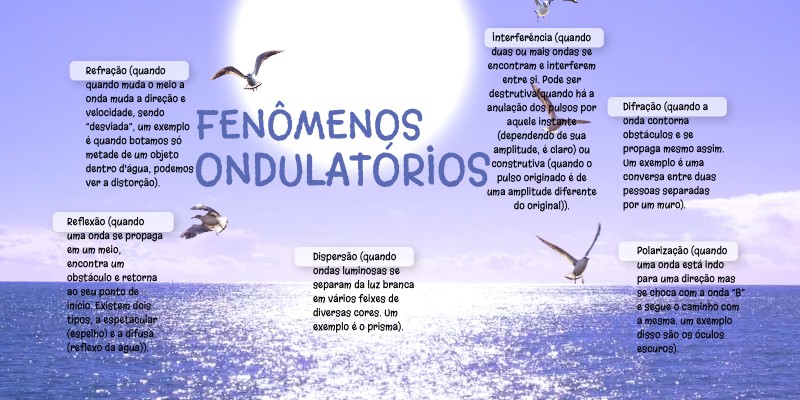 Reflexão (quando uma onda se propaga em um meio, encontra um obstáculo e retorna ao seu ponto de início. Existem dois tipos, a espetacular (espelho) e a difusa (reflexo da água)).