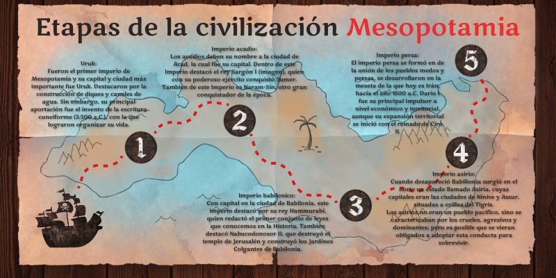 Imperio babilonico: Con capital en la ciudad de Babilonia, este imperio destacó por su rey Hammurabi, quien redactó el primer conjunto de leyes que conocemos en la Historia. También destacó Nabucodonosor II, que destruyó el templo de Jerusalén y construyó los Jardines Colgantes de Babilonia.