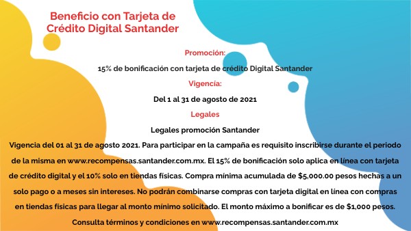 Promoción:15% de bonificación con tarjeta de crédito Digital SantanderVigencía: Del 1 al 31 de agosto de 2021 Legales Legales promoción Santander Vigencia del 01 al 31 de agosto 2021. Para participar en la campaña es requisito inscribirse durante el periodo de la misma en www.recompensas.santander.com.mx. El 15% de bonificación solo aplica en línea con tarjeta de crédito digital y el 10% solo en tiendas físicas. Compra mínima acumulada de $5,000.00 pesos hechas a un solo pago o a meses sin intereses. No podrán combinarse compras con tarjeta digital en línea con compras en tiendas físicas para llegar al monto mínimo solicitado. El monto máximo a bonificar es de $1,000 pesos. Consulta términos y condiciones en www.recompensas.santander.com.mx