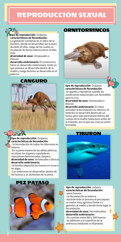 tipo de reproducción: ovíparacaracterísticas de fecundación:-pone huevos-La fecundación es externa-durante todo el proceso el pez payaso se vuelve muy agresivo frente a s gametos al medio y donde tiene lugar la fecundacióndiversidad de sexo: Hermafroditasdesarrollo embrionario: -Se cuentan entre 300 y 500 huevos-se adhieren a la superficie de la anémona mediante un filamento