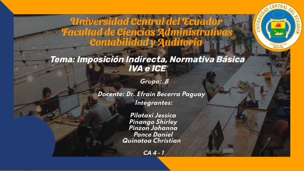 BibliografíaLavignolle, J. M. (2020). El IVA: Un impuesto que debe soportar el consumidor. Obtenido de https://www.palermo.edu/economicas/noticias/iva.html Silva, T. R. (2017). ADMINISTRACION TRIBUTARIA. Obtenido de https://docplayer.es/86045645-Universidad-central-del-ecuador-de-ciencias-administrativas-modalidad-a-distancia-unidad-didactica-administracion-tributaria.html