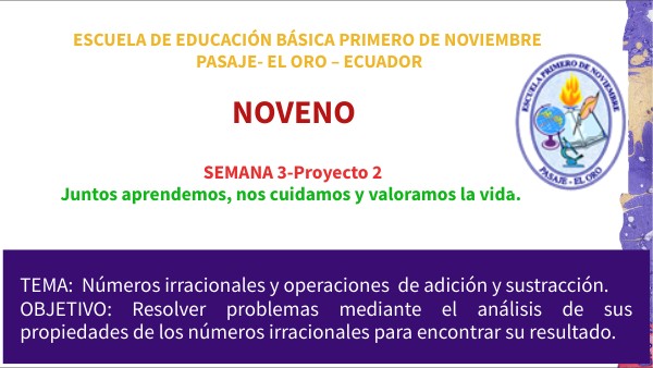 TEMA: Números irracionales y operaciones de adición y sustracción. OBJETIVO: Resolver problemas mediante el análisis de sus propiedades de los números irracionales para encontrar su resultado.