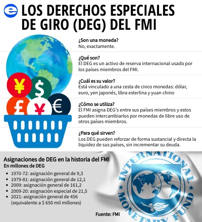 ¿Son una moneda? No, exactamente. ¿Qué son? El DEG es un activo de reserva internacional usado por los países miembros del FMI. ¿Cuál es su valor? Está vinculado a una cesta de cinco monedas: dólar, euro, yen japonés, libra esterlina y yuan chino ¿Cómo se utiliza? El FMI asigna DEG's entre sus países miembros y estos pueden intercambiarlos por monedas de libre uso de otros países miembros. ¿Para qué sirven? Los DEG pueden reforzar de forma sustancial y directa la liquidez de sus países, sin incrementar su deuda.