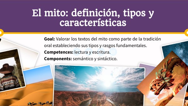 Goal: Valorar los textos del mito como parte de la tradición oral estableciendo sus tipos y rasgos fundamentales.Competences: lectura y escritura. Components: semántico y sintáctico.