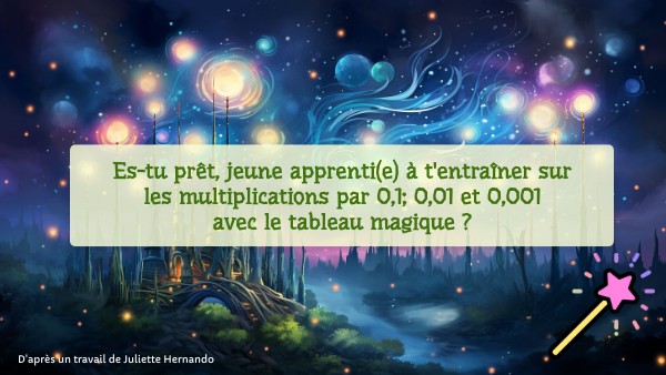 Es-tu prêt, jeune apprenti(e) à t'entraîner sur les multiplications par 0,1; 0,01 et 0,001avec le tableau magique ?