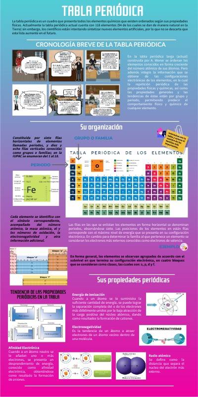 La tabla periódica es un cuadro que presenta todos los elementos químicos que existen ordenados según sus propiedades físicas. Actualmente la tabla periódica actual cuenta con 118 elementos (94 de los cuales se dan de manera natural en la Tierra) sin embargo, los científicos están intentando sintetizar nuevos elementos artificiales, por lo que no se descarta que esta lista aumente en el futuro.