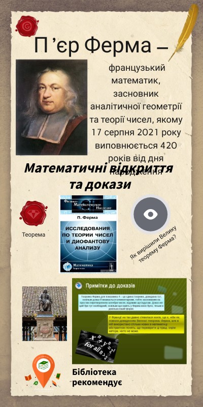 французький математик, засновник аналітичної геометрії та теорії чисел, якому 17 серпня 2021 року виповнюється 420 років від дня народження